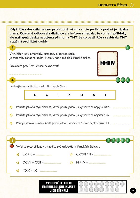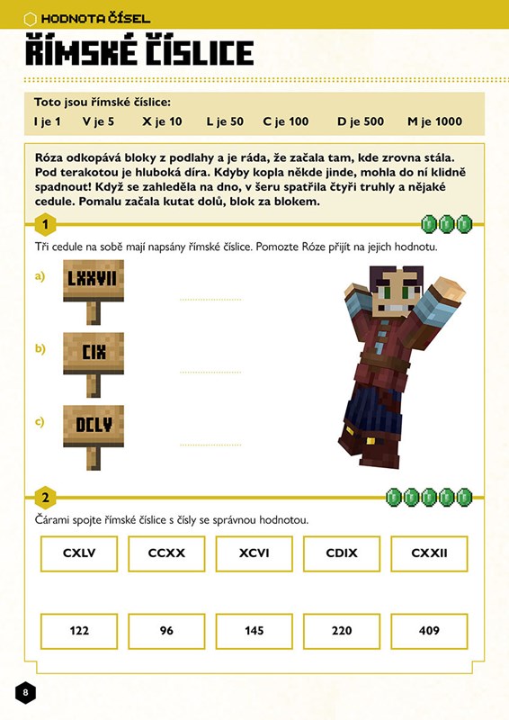 Vyřešte matematické úlohy a pomozte tím hrdinům ze světa Minecraftu na jejich misích. Čekají vás číselné řady, klasické početní příklady, zlomky, míry i geometrie a statistika. Prozkoumejte v každém tématu různé biomy, získejte během procházení knihou emeraldy a zvolte si, jak s nimi naložíte.