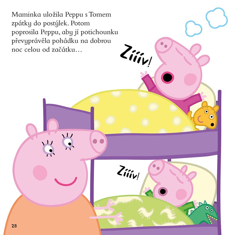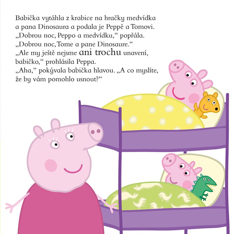Je čas jít do postýlek, jenže Peppa ani Tom nejsou ani trochu, ale opravdu ani trochu unavení. Pomůže jim usnout pohádka na dobrou noc od babičky, dědečka, maminky a tatínka? Co myslíte?
