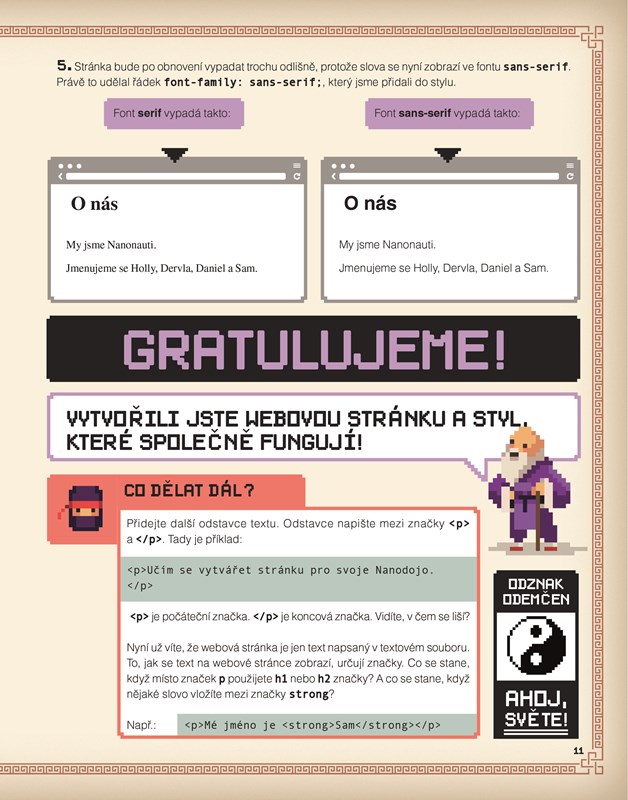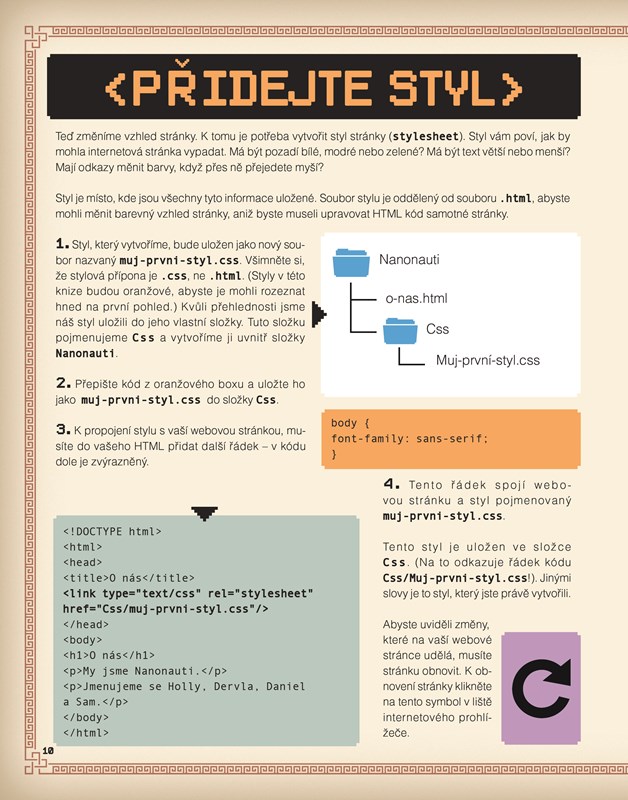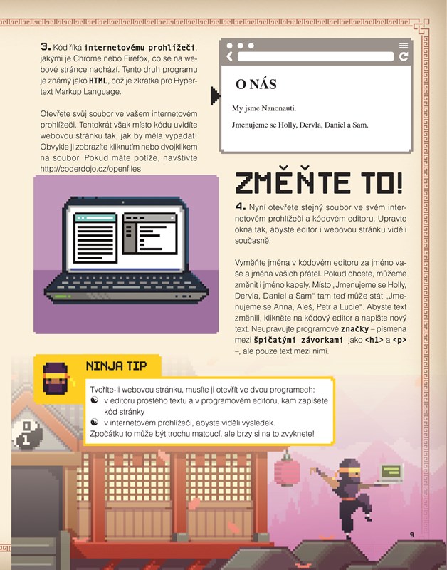 Tato kniha je o psaní kódů. Naučíte se postupně, krok za krokem vytvářet svou vlastní webovou stránku pomocí HTML, CSS a JavaScript! První programátorské kroky budete dělat společně se svými virtuálními kamarády z programátorského klubu CoderDojo, každý nový krok si můžete ověřit na webových stránkách.
