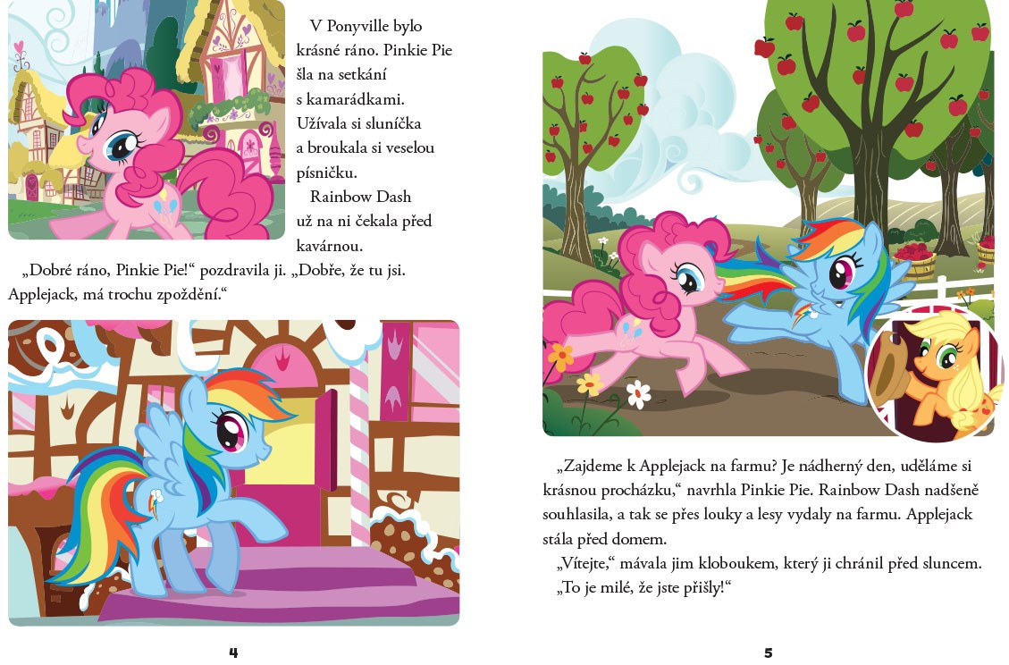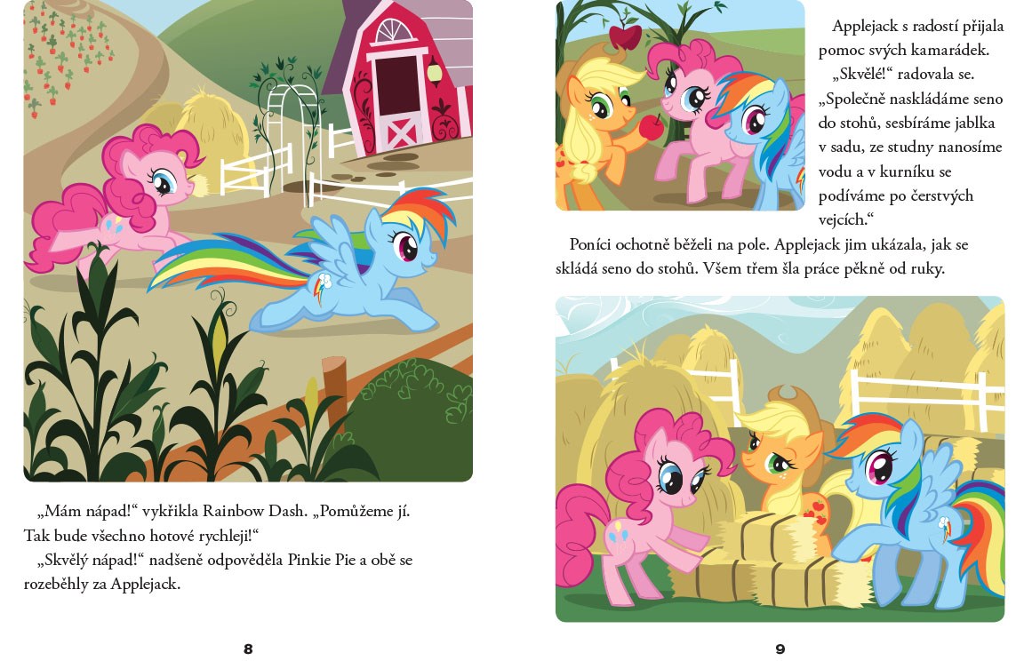 Vydejte se s námi do kouzelného světa poníků! V této knize najdete hned čtyři příběhy, které si můžete číst před spaním. Navštívíme farmu Applejack a spolu s poníky pochopíme, že dobří přátelé si pomáhají. Dozvíme se, jak poníci získávají symboly, které mají na svém boku. S Twilight poznáme, že doma je nejlépe a nakonec se s poníky vydáme do sadu posbírat všechna jablka.
