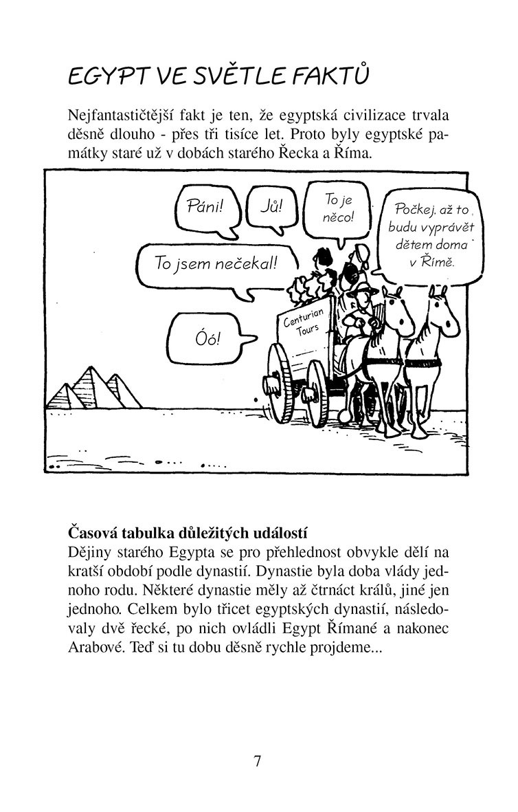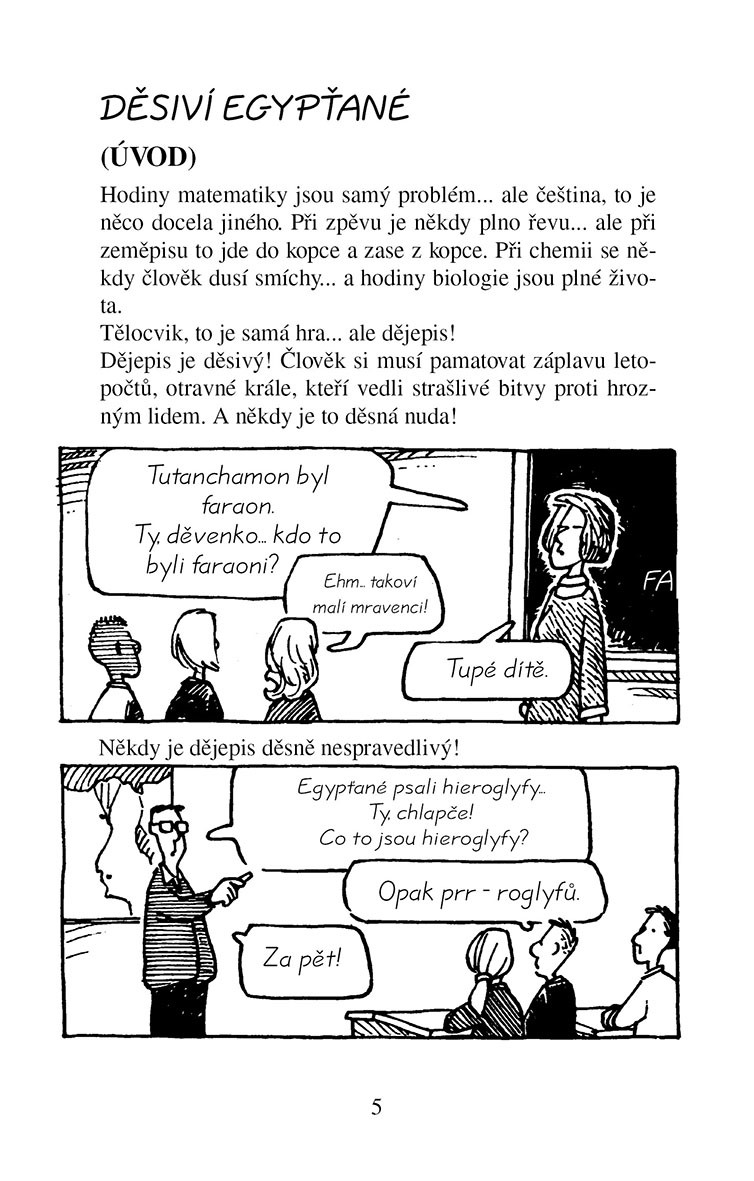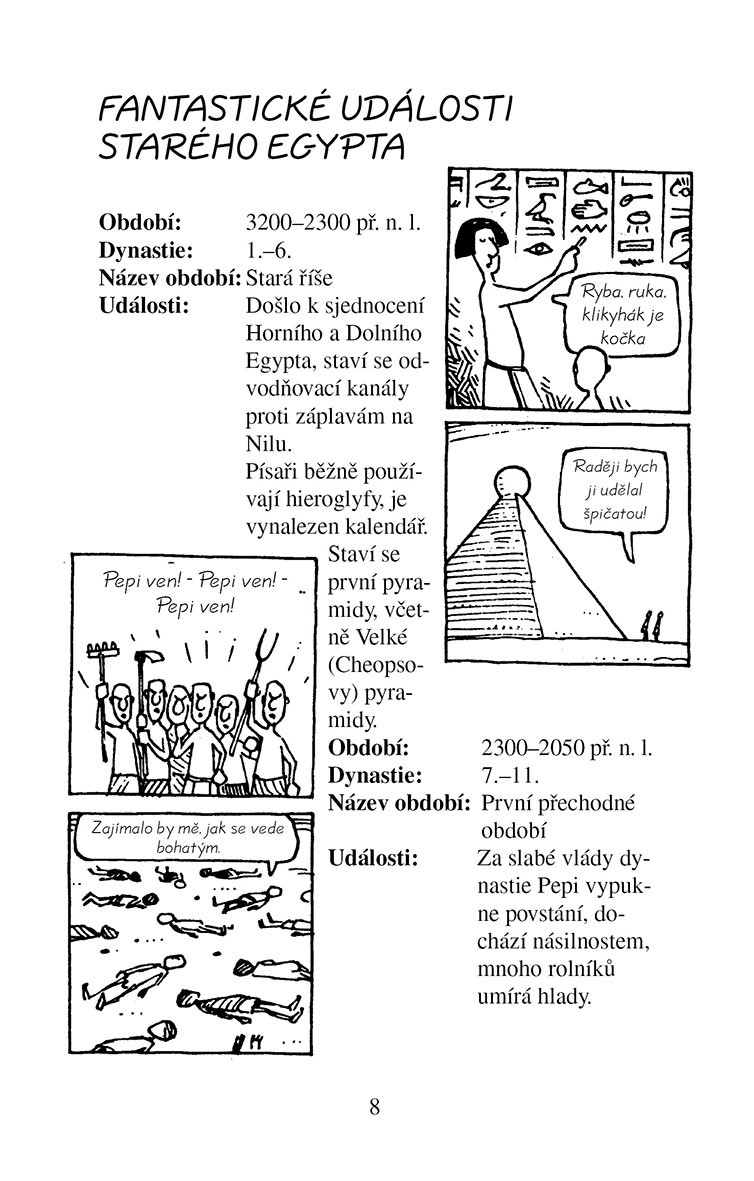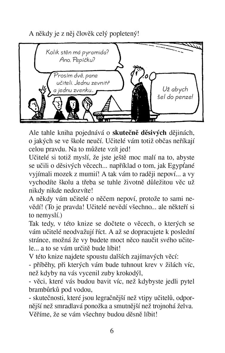 Dozvíte se například, který faraon měl na obličeji nejvíc beďarů, proč museli někteří faraoni nosit umělé vousy nebo jak léčili Egypťané slepotu. Při čtení narazíte také na velmi nechutné příběhy plné mrtvol, naučíte se, jak se dělá mumie, najdete 3000 let starý recept na nepoživatelné cukroví a nakonec pochopíte i něco málo z úděsné egyptské matiky.