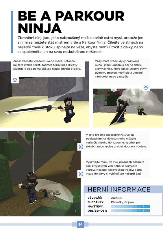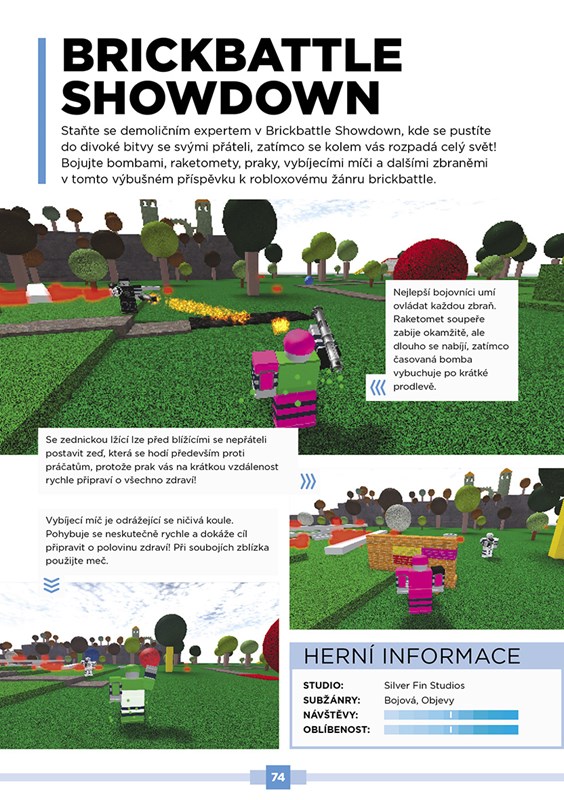 Roblox je plný vzrušujících her, které vás staví proti jiným ctihodným soupeřům. Pokud se vydáte do bitvy, měli byste se řádně připravit. Ať už se vydáte na gigantickou překážkovou dráhu, bojujete s futuristickou vojenskou silou nebo se vyhýbáte při neúprosné vybíjené, oficiální příručka Nejlepší bojové hry vám poskytne výhodu, kterou potřebujete k úspěchu. Je plná užitečných informací a rozhovorů s tvůrci her, což z ní činí nezbytnou knihu pro všechny Robloxiany.