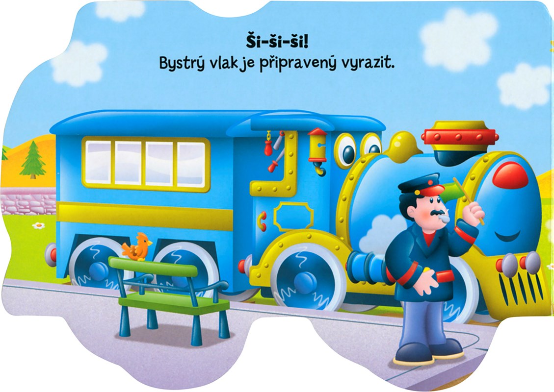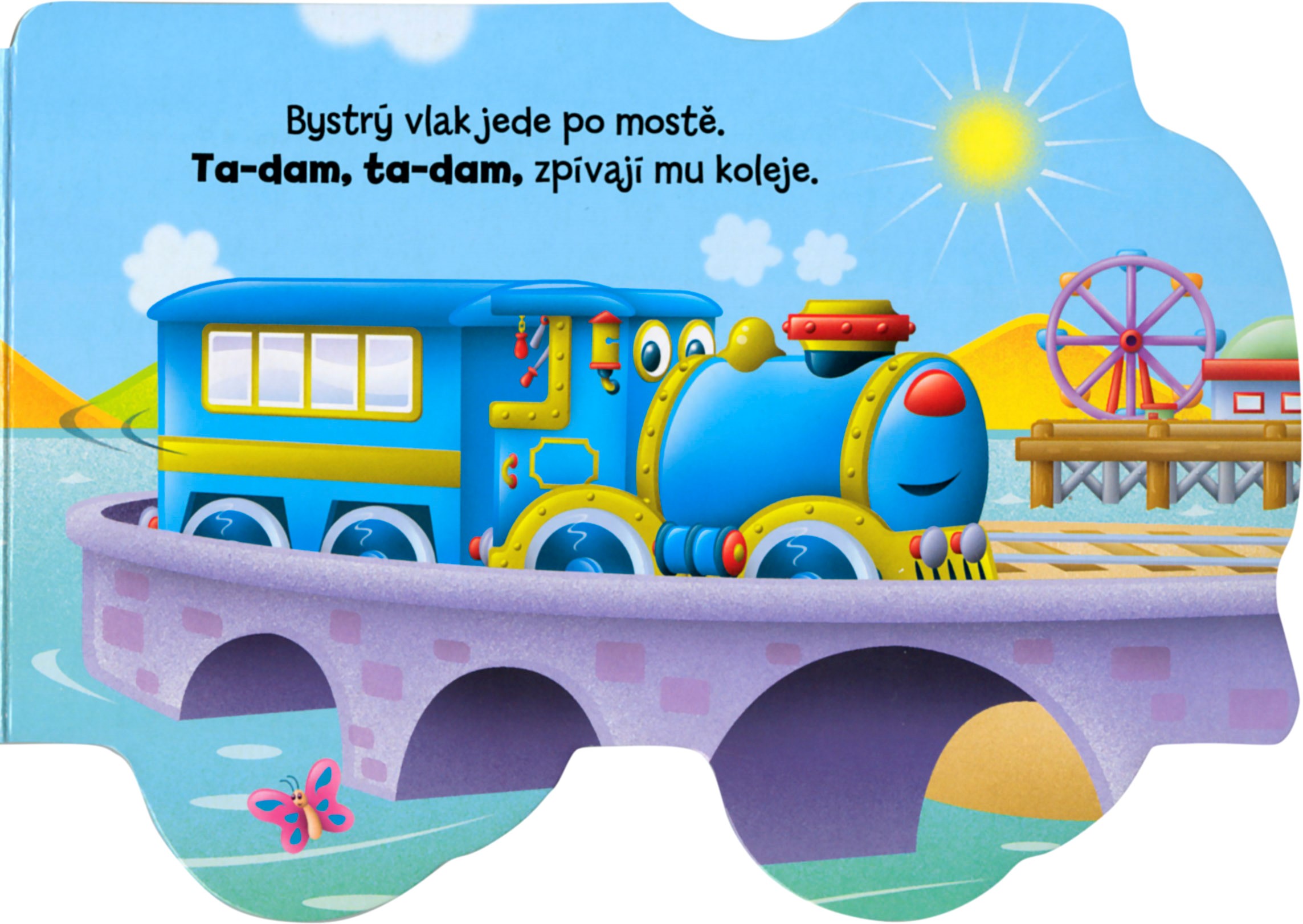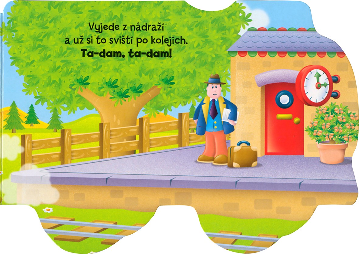 Bystrý vlak čeká na kolejích náročný den. Už od rána sviští po trati, přes mosty, kolem moře a polí až do kopců. Přečtěte si, kudy projíždí, a říkejte, co vidíte na obrázcích.