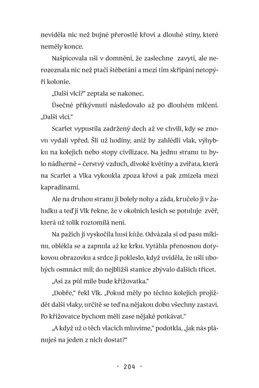 Pokračování románu Cinder a druhá kniha ságy Měsíční kroniky. Osmnáctiletá Scarlet je přesvědčena, že se o sebe dokáže postarat sama, protože k samostatnosti ji vedla její babička. Jenže jednoho dne babička záhadně zmizí a něco s tím má do činění gang nebezpečných mladíků, který řídí divoký Vlk. Dokáže najít vysvětlení, do čeho se její rodina zapletla, zapojit se do boje po boku Cinder a najít svou životní lásku?