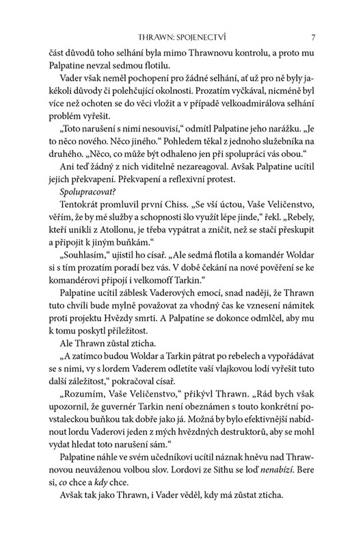 Osudová slova, hlavně když jsou vyřčena císařem Palpatinem. Na Batuu, hraničním světě Neznámých oblastí, zapouští kořeny hrozba Impériu. Existuje zatím jen v náznacích, jejichž důsledky nelze tušit. Vůdci Impéria však přesto stojí za to, aby pověřil jejím prošetřením své nejschopnější zástupce: nemilosrdného vykonavatele lorda Dartha Vadera a brilantního stratéga velkoadmirála Thrawna. Zdá se nepravděpodobné, že by se tito velcí soupeři o přízeň císaře a otevření odpůrci v imperiálních záležitostech – včetně projektu Hvězdy smrti – dokázali společně vydat na tak klíčově důležitou misi. Císař však ví, že to nebude poprvé, kdy Vader spojí síly s Thrawnem. A za jeho císařským rozkazem je mnohem víc, než ti dva tuší.
