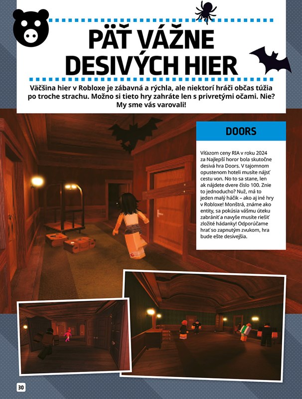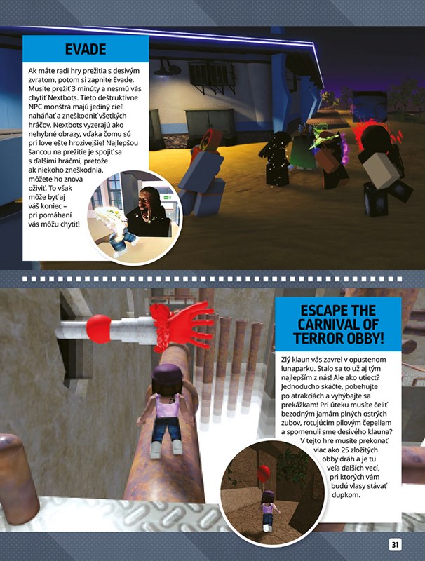 Prečítajte si o všetkých zaujímavostiach, ktoré sa dejú vo svete Robloxu! V tejto knihe vám predstavíme tie najlepšie hry na prežitie, bojové hry, horory, prekážkové dráhy, tycoony alebo simulátory. Vezmeme vás do úžasného sveta maznáčikov, ktorých môžete zbierať alebo vymieňať, a dáme vám pár rád, ako uspieť v pretekárskych hrách.