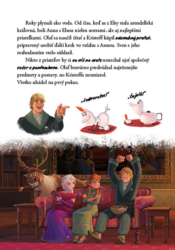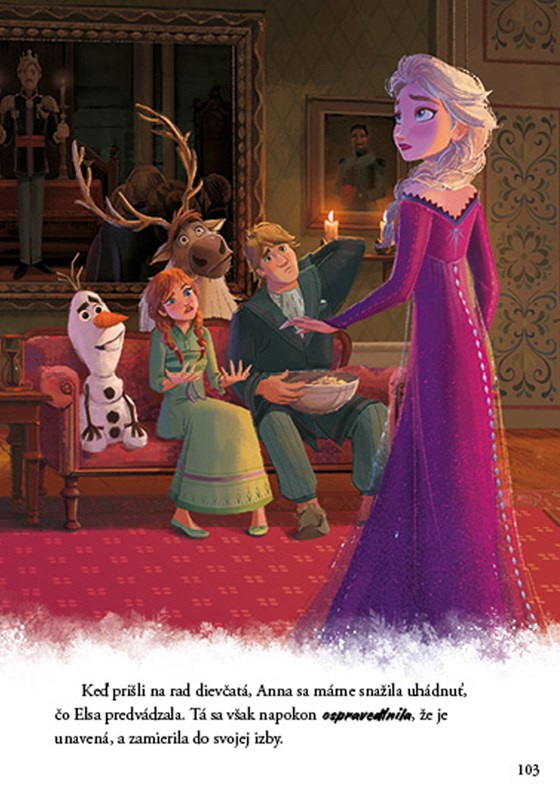 V tejto knihe nájdete navyše aj pokračovanie! Kráľovnej Else znie v hlave tajomný hlas a láka ju do neznáma. Elsa ho nasleduje, pretože dúfa, že sa od neho dozvie, odkiaľ pochádza jej čarovná moc. Cesta ich zavedie do Začarovaného lesa, kde zistí, že najskôr musí napraviť krivdy z minulosti. Až potom Elsa dorazí k bájnej rieke Ahtohallan a tam objaví, kým v skutočnosti je a kde je jej miesto v živote.