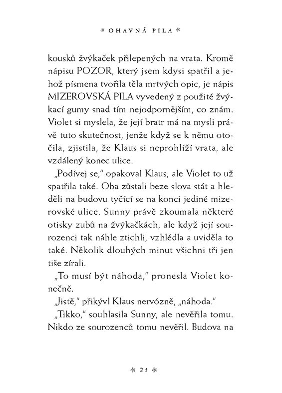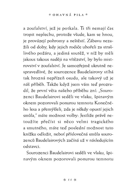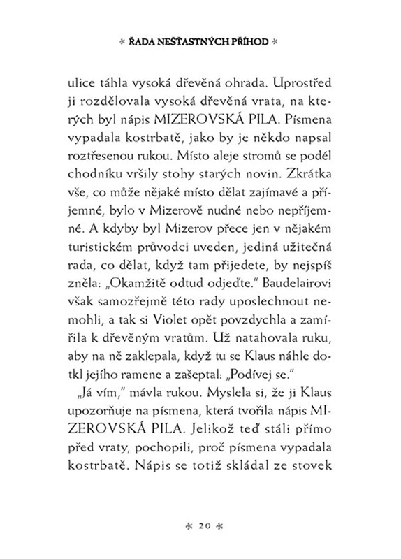 Ve čtvrtém příběhu kultovní série se sourozenci Baudelairovi dostanou do města Mizerova ke svému dalšímu opatrovníkovi. Tam jsou nuceni pracovat na pile, a chybí jen málo, aby propadli holému zoufalství a beznaději. Čtenáři budiž varováni, že stránky této knihy skrývají takové hrůzy, jako je obří drátovačka, guláš nevalné chuti, muž neustále zahalený v oblaku kouře, hypnóza a na závěr dokonce osudová nehoda.