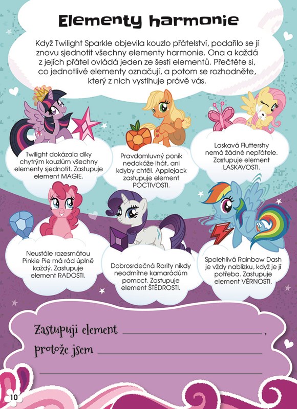 "Přátelství je magické", říkají poníci z Ponyville. V této báječné knížce zjistíte, kterému z poníků se nejvíce podobáte, navrhnete si osobní značku, objevíte svůj element harmonie a spoustu dalšího!