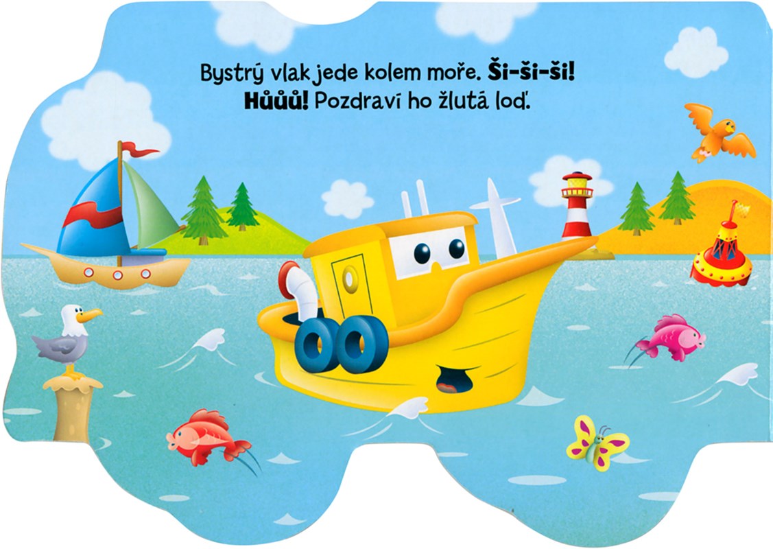 Bystrý vlak čeká na kolejích náročný den. Už od rána sviští po trati, přes mosty, kolem moře a polí až do kopců. Přečtěte si, kudy projíždí, a říkejte, co vidíte na obrázcích.