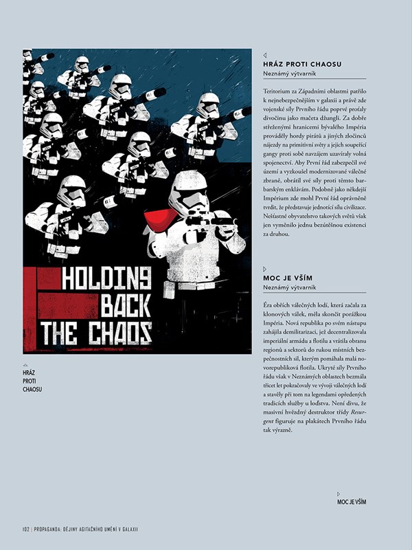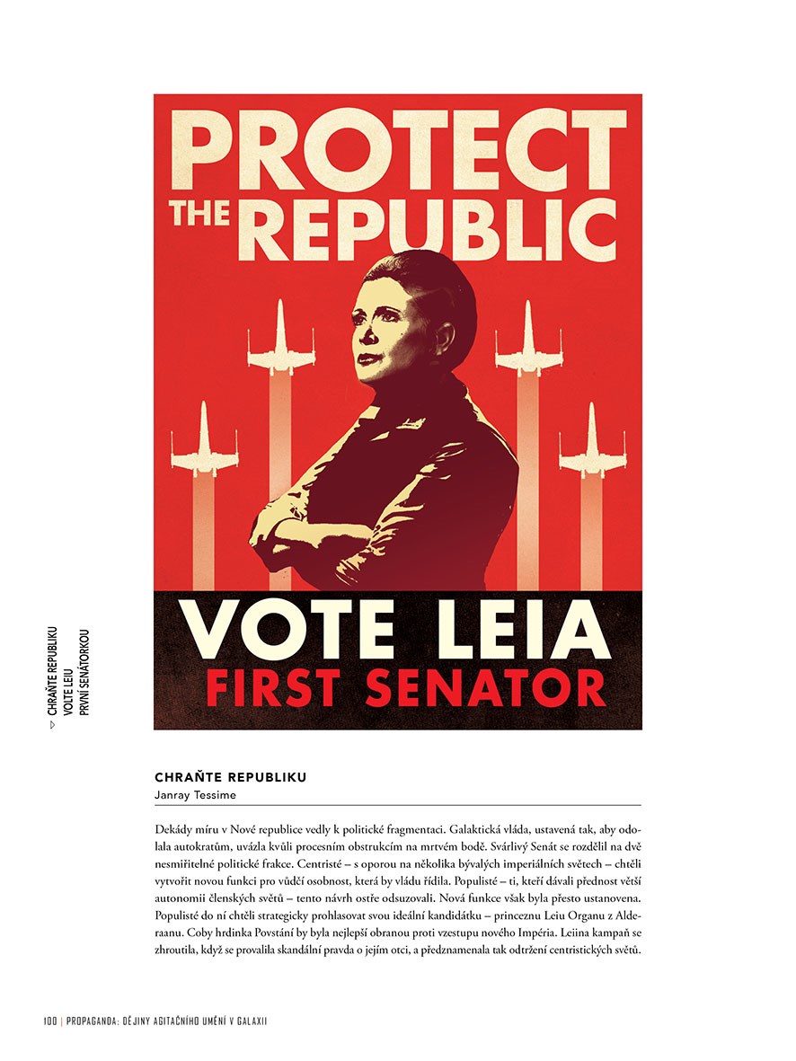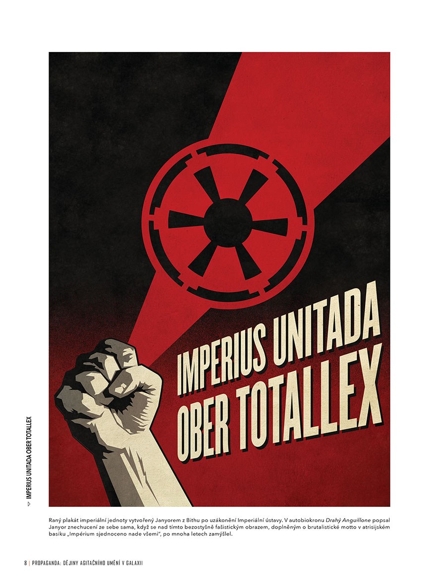 Propagandistické ilustrace se staly synonymem života v předaleké galaxii. Ať už se jedná o plakát hvězdného destruktoru visícího nad planetou a symbolizujícího imperiální nadvládu, znak nastříkaný na zeď jako poselství naděje Povstalecké aliance, nebo nástěnnou malbu zobrazující sešikované stormtroopery na znamení jednoty Prvního řádu, tento druh výtvarného umění coby nástroj vášnivého idealismu i podněcování strachu zachycuje neustále se měnící politickou situaci a náladu veřejnosti po celé galaxii.