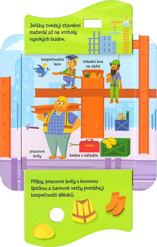 Hledejte a objevujte, co se děje na staveništi! Otevřete okénka a nakoukněte pod ně! S pomocí této knížky si dítě hravou formou osvojí nová slovíčka, zlepší schopnost koncentrace a procvičí si jemnou motoriku.