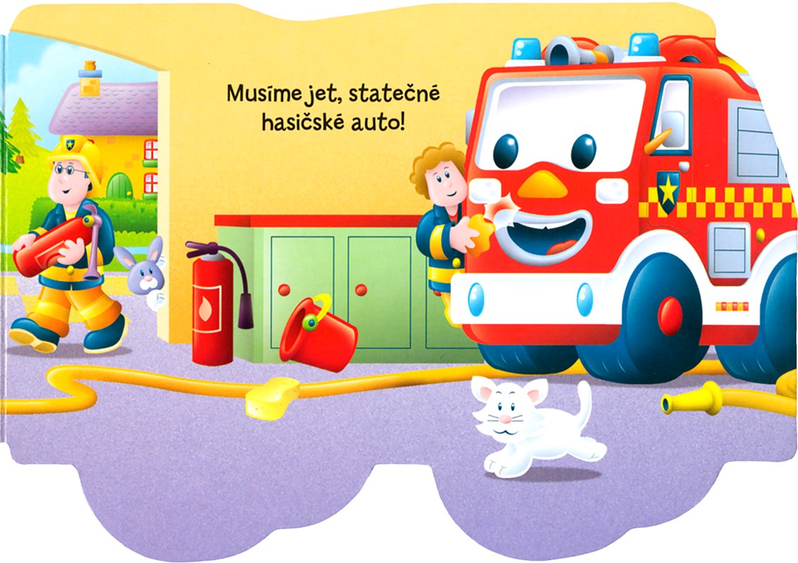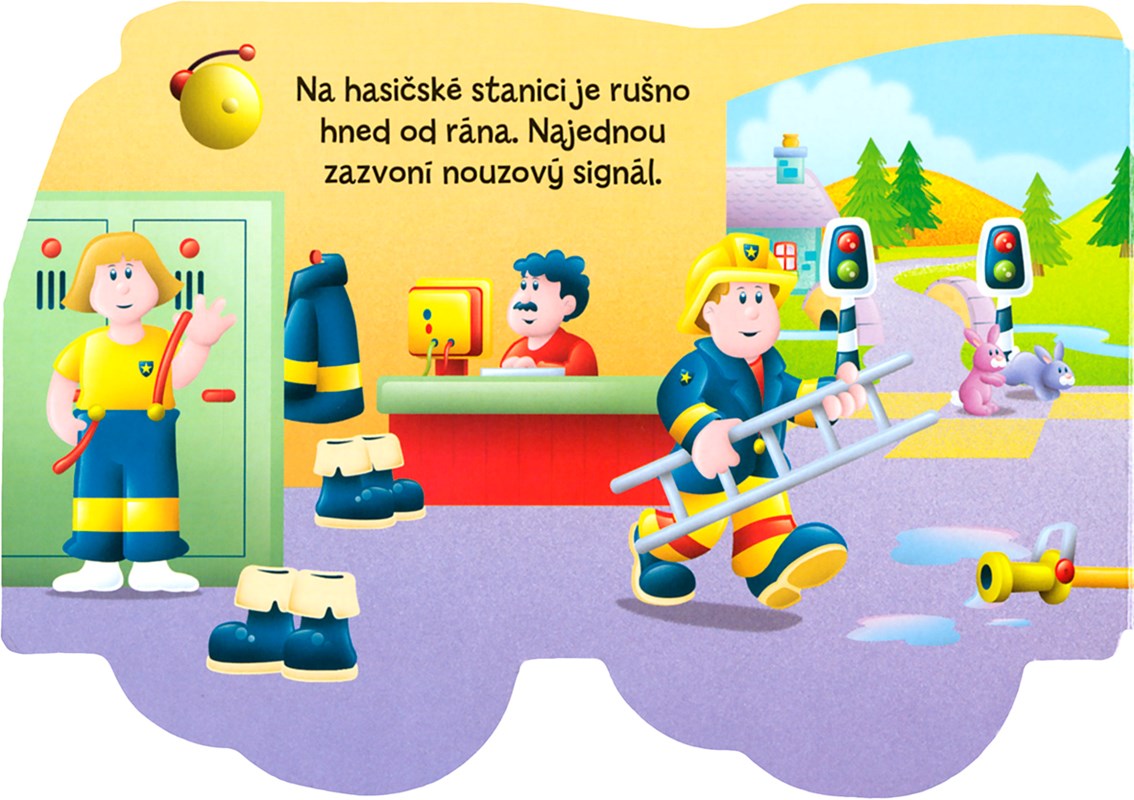 Na hasičské stanici je už od rána živo. Hasičské auto je připravené pomoci v nouzi. Přečtěte si, koho zachraňuje, a říkejte, co vidíte na obrázcích.