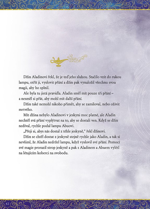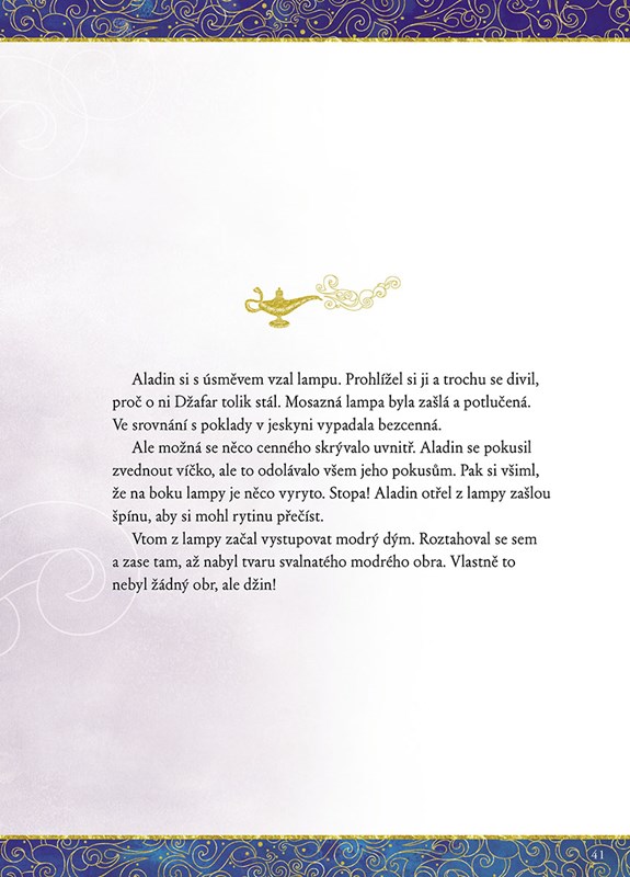 Aladina si všimne vezír Džafar, který baží po vládě nad Agrabahem. Vezme ho k Jeskyni zázraků a rozkáže mu, aby z ní přinesl starou lampu. Lampa je kouzelná a džin v ní zakletý musí svému pánovi splnit tři přání. Když však lampa připadne Aladinovi, pohádkové dobrodružství může začít!