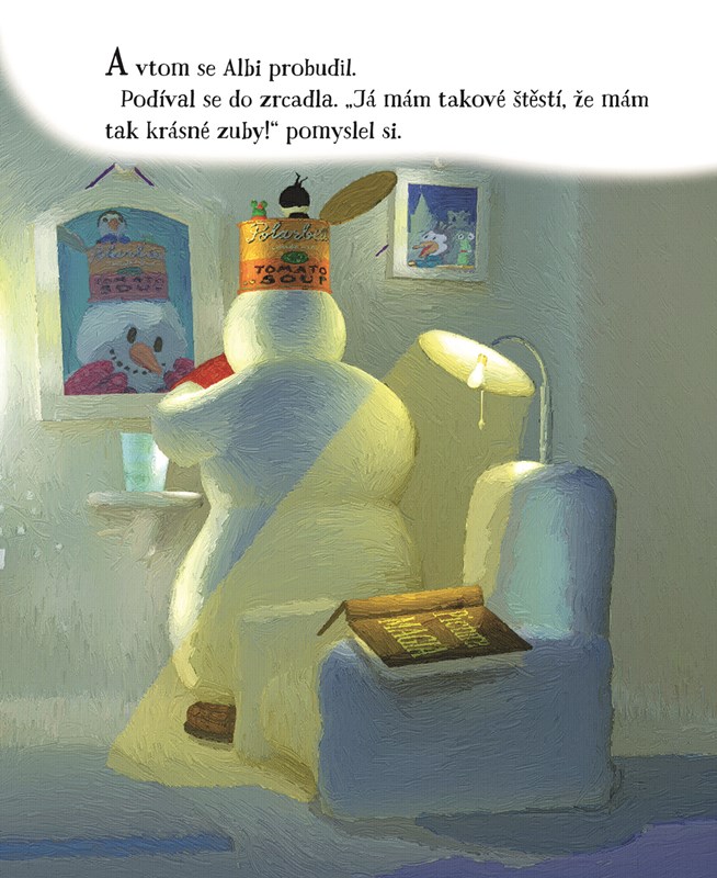 Albi je malý sněhulák. Bydlí v útulném sněhovém hradě v překrásné ledové zemi, kde sníh nikdy neroztaje. Rád sedává ve svém pohodlném křesle a čte si knížky. Často u toho ovšem usne.