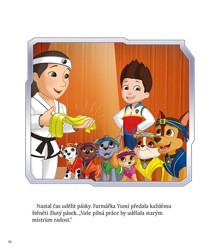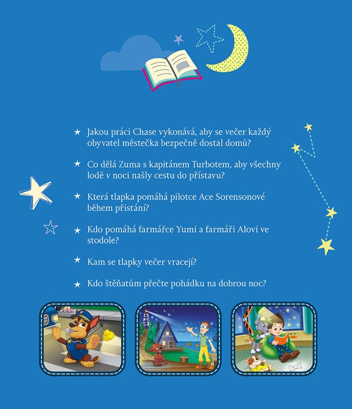 Chcete před spaním zažít parádní dobrodružství s Tlapkovou patrolou? Tak honem do postýlky s pohádkou! Tým odvážných hrdinů bude tentokrát zachraňovat chobotničku v nesnázích, zúčastní se napínavého závodu v Adventure Bay, vyzkouší si bojová umění, a když si Chase zlomí zoubek, navštíví i zubařskou ordinaci. Štěňata vyrážejí do akce, aby podala pomocnou tlapku kamarádům v nouzi. Na konci každého ze sedmi příběhů vás navíc čeká báječné překvapení: můžete si užít spoustu zábavy s otázkami k přečtené pohádce.
