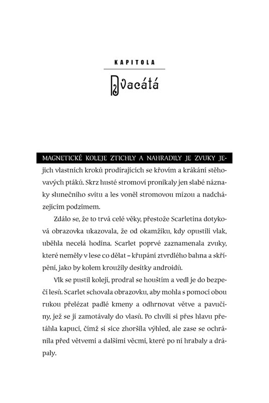 Pokračování románu Cinder a druhá kniha ságy Měsíční kroniky. Osmnáctiletá Scarlet je přesvědčena, že se o sebe dokáže postarat sama, protože k samostatnosti ji vedla její babička. Jenže jednoho dne babička záhadně zmizí a něco s tím má do činění gang nebezpečných mladíků, který řídí divoký Vlk. Dokáže najít vysvětlení, do čeho se její rodina zapletla, zapojit se do boje po boku Cinder a najít svou životní lásku?