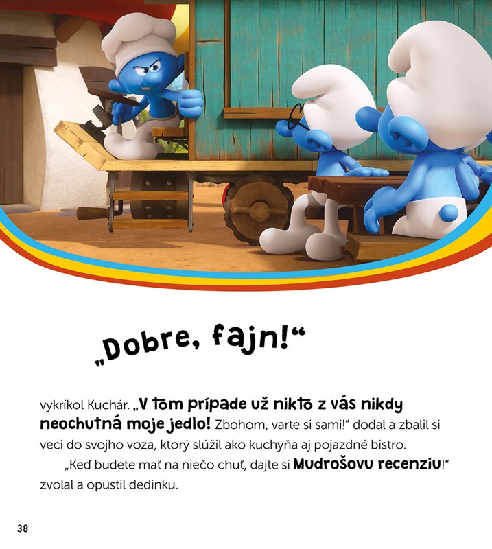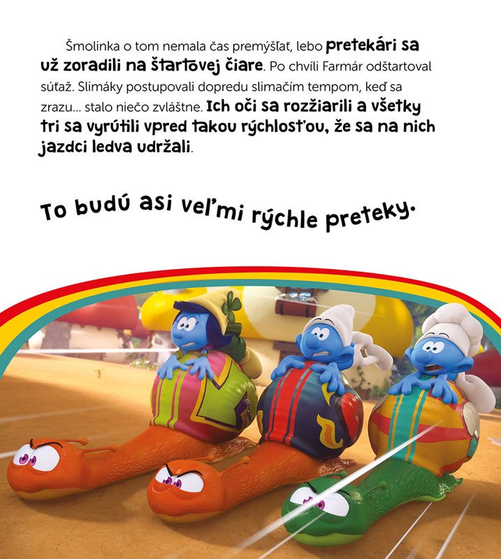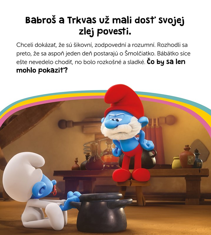 Pohodlne si sadnite a pozrite sa, čo je nové v dedinke šmolkov. Ako si šmolkovia poradia s nedostatkom šmolbobúľ? Ako dopadne nedorozumenie medzi Kuchárom a Mudrošom? Sú Babroš a Trkvas zodpovední opatrovatelia Šmolčiatka? Ako dopadnú napínavé slimačie preteky? Táto kniha obsahuje štyri príhody napísané podľa televízneho seriálu a navyše aj absolútny hit – filmový príbeh, ktorý vás zavedie ďaleko za hranice šmolkovského sveta!